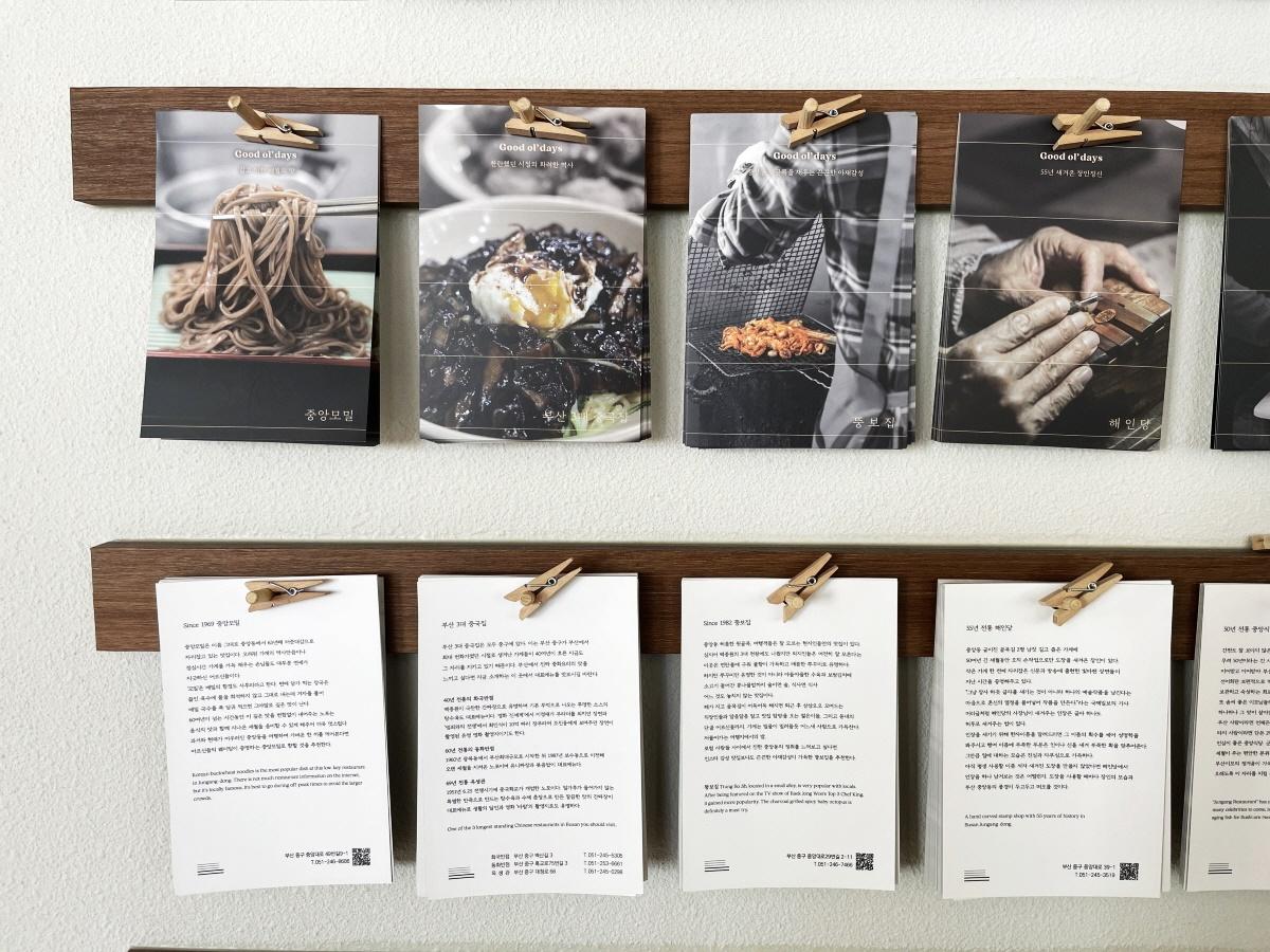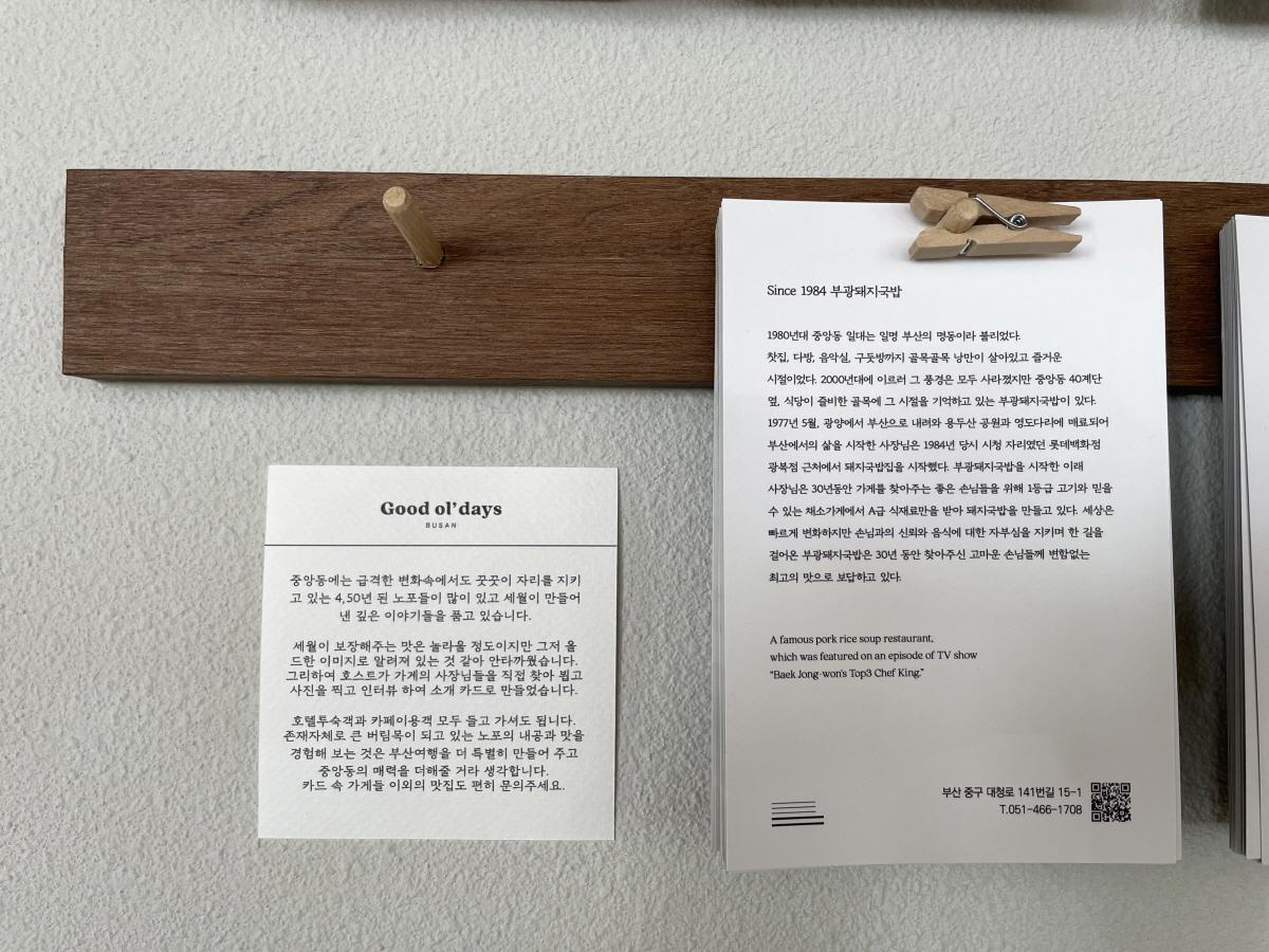 墙上还介绍了「釜山三大中国餐厅」、「55年传统印章工匠」、「40年猪肉汤饭」等在地名店与工坊,虽然是推荐景点,但Good ol’ days设计出具有一致性风格的宣传册,可以看出店家从小细节上就非常用心。