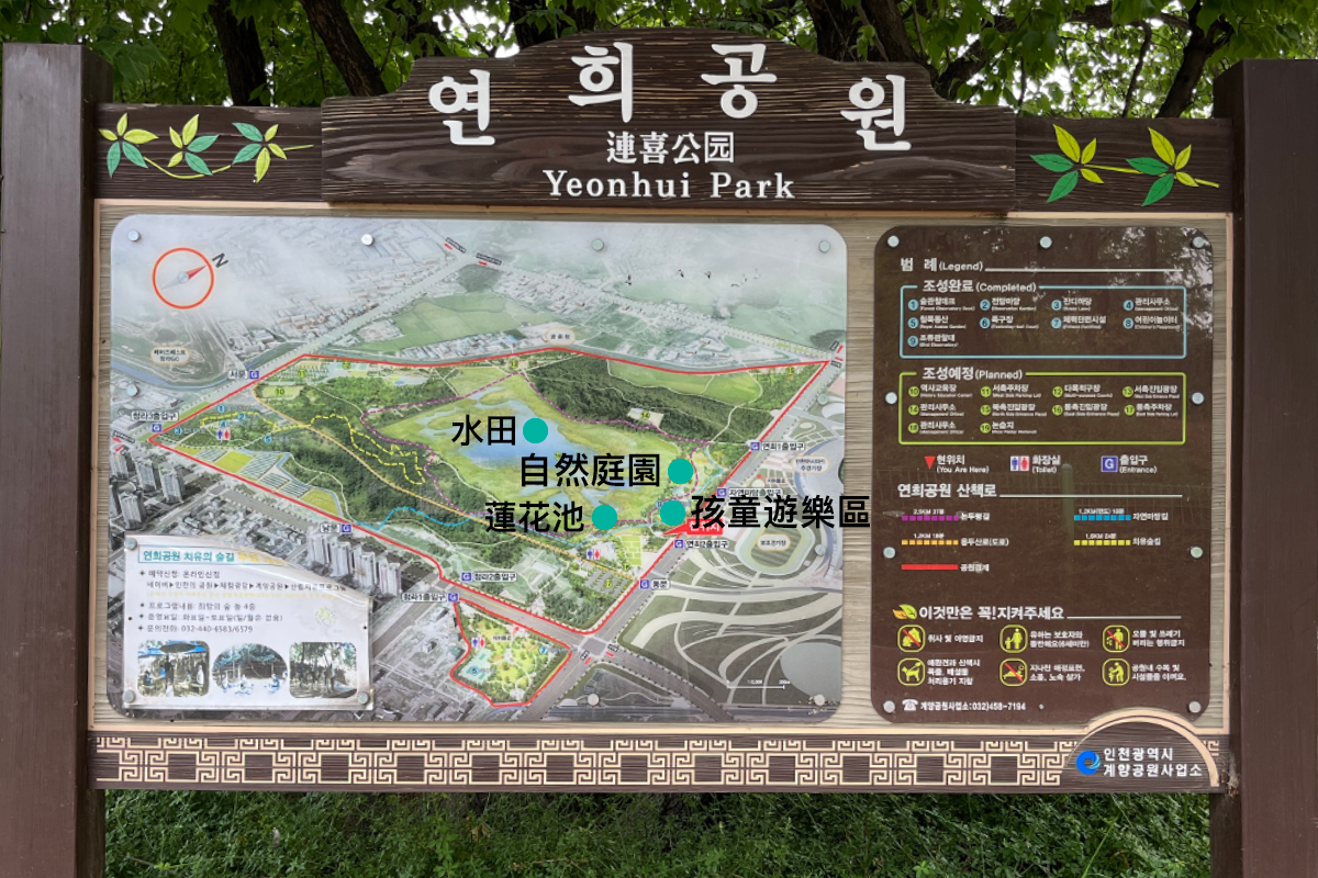上图是仁川连喜公园的地图,蓝色的路线是较适合游客们的路线,不少人会在「自然庭园」野餐,也有许多孩童会在「孩童游乐区」嬉戏。