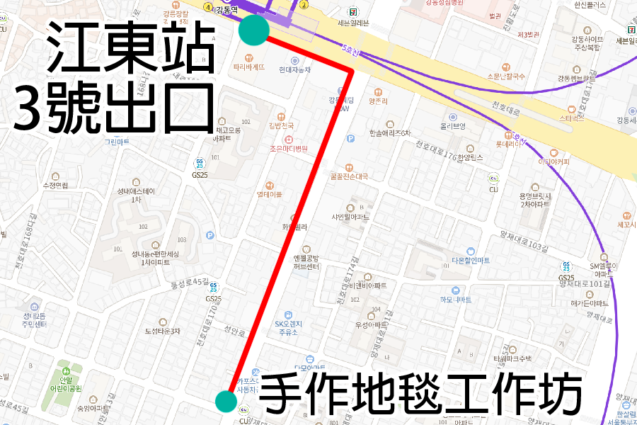 - 小撇步:首尔地铁5号线江东站(강동역)3号出口出来直走,在第二个路口右转,一路直走(约5分钟),左前方看到CU便利商店时,这一侧就是工作坊了。