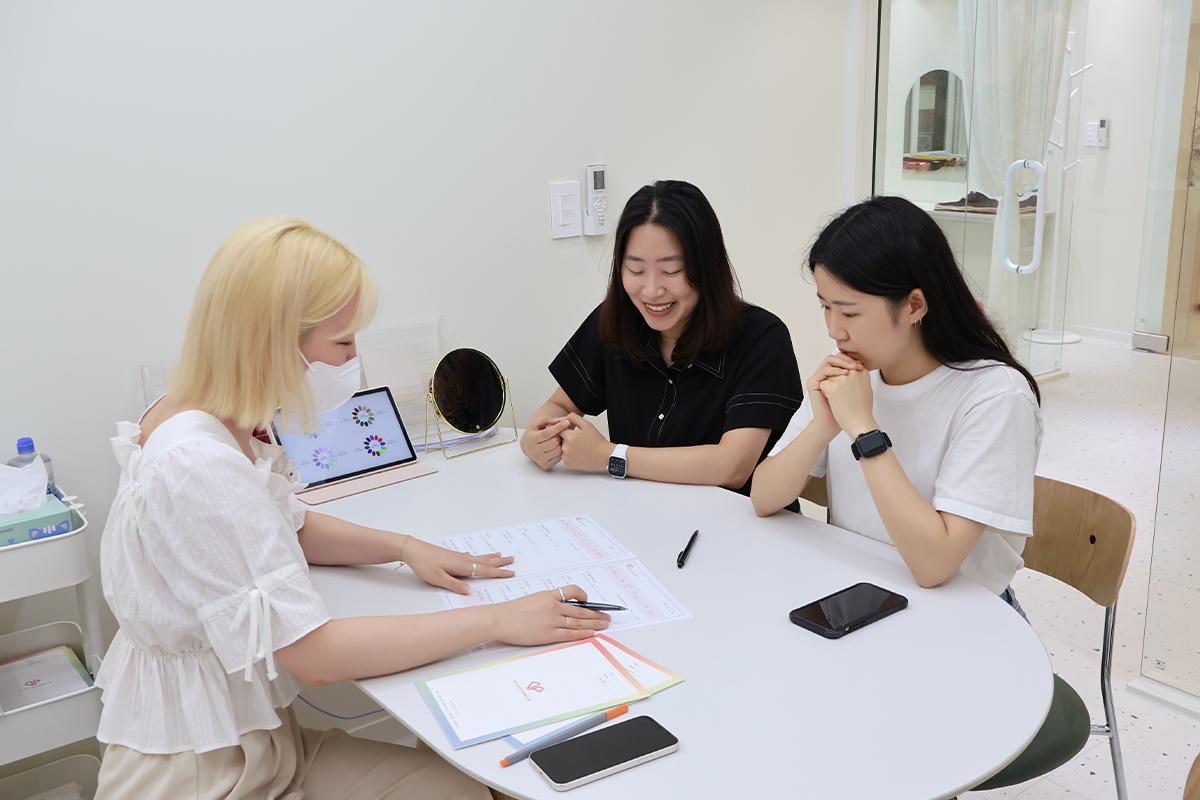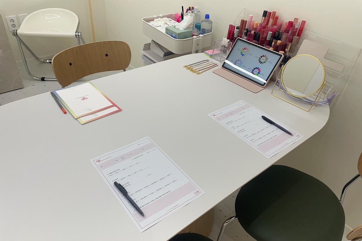 完成问卷后,DAMPPEUM的专业色彩老师会基于问卷的回答进行讨论,因为小编写得很详细,从平时的化妆品型号到色号都有记下,这样可以让老师省去很多询问的时间。