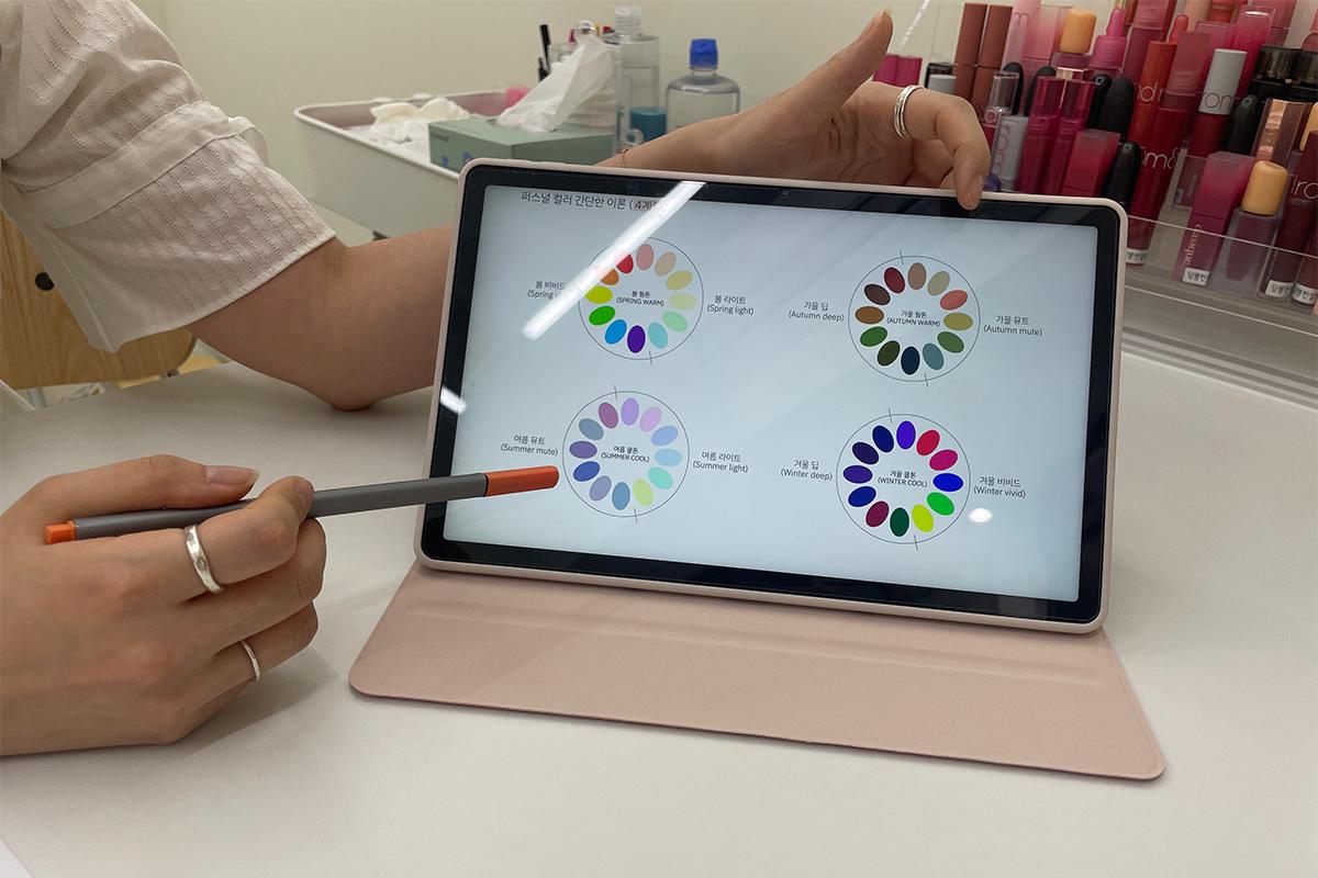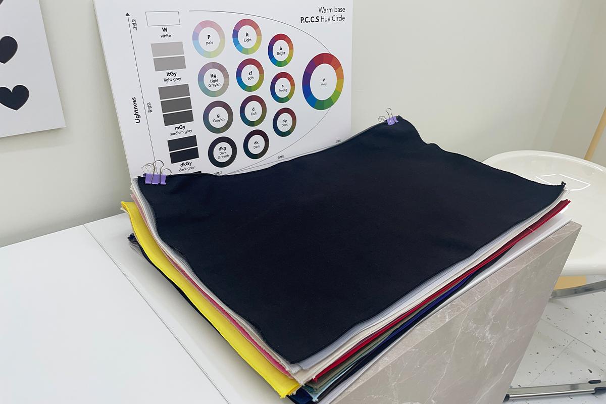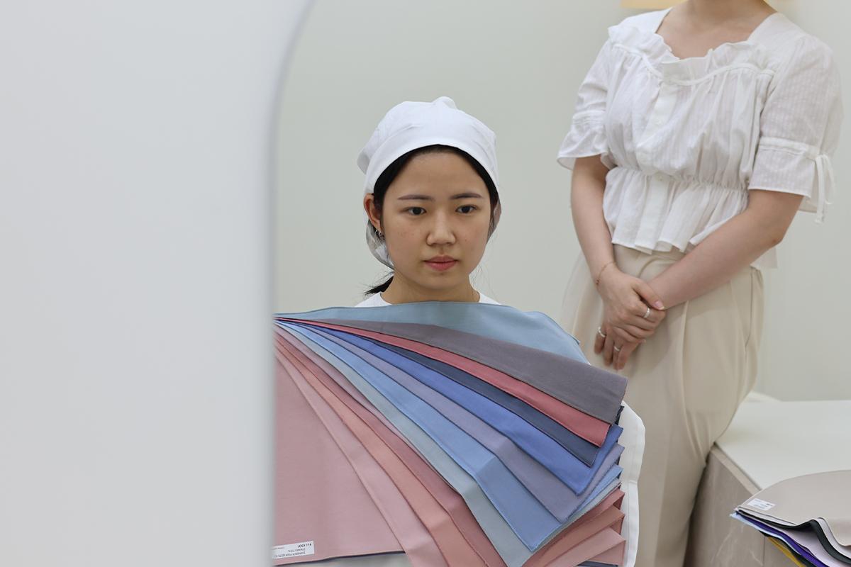 按照春秋暖色调、中性色调、亮色调、夏冬冷色调、中性色调、亮色调的顺序来进行个人色彩检测,DAMPPEUM的老师会详细说明色板上的颜色,以便更准确地进行分析。