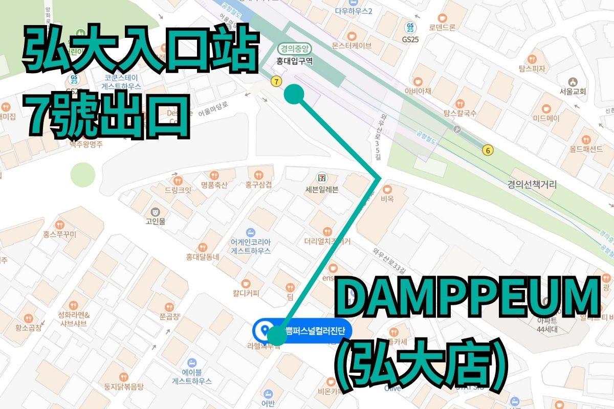 - 小撇步:首尔地铁2号线弘大入口站(홍대입구역)7号出口出来下阶梯后左转直走,于第一个巷子右转,直走约100公尺经过一个路口前方即可看到招牌,上3楼抵达DAMPPEUM(弘大店)。