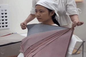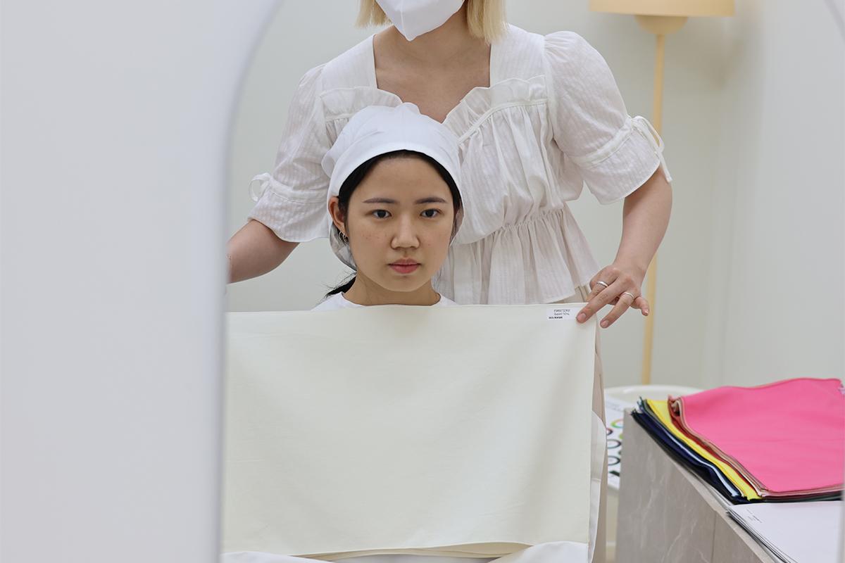在咨询结束后会马上开始检测,为了确保准确性,在戴上头巾之前会先用发色进行第一轮皮肤,接下来就是身上盖上白布,根据肤色进行分析并提供适合的化妆品颜色建议。