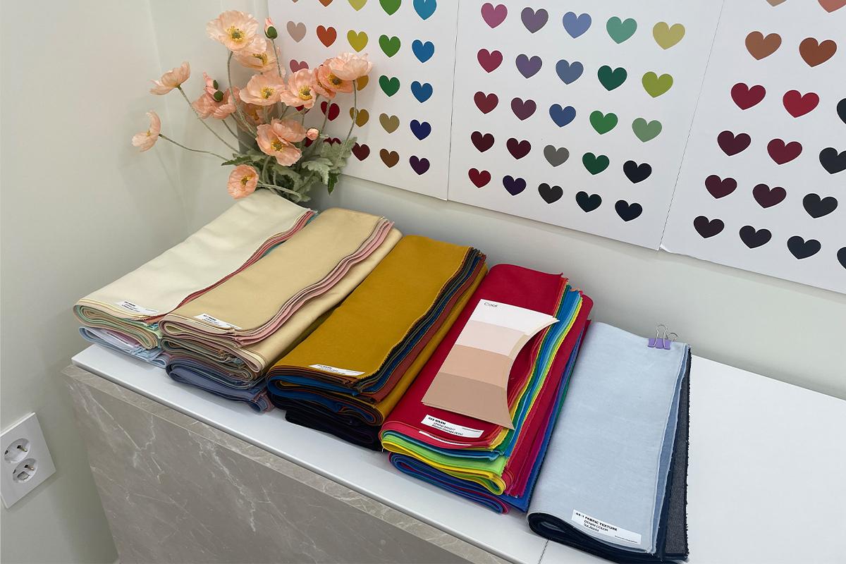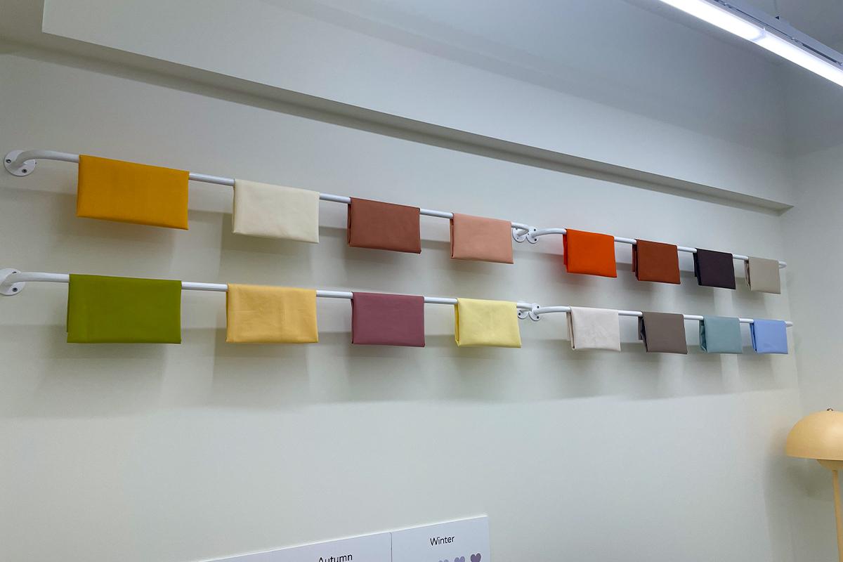 最里面的柜子上挂著各种色彩缤纷的布,感觉真的超专业,在下层的架子上,整齐地摆放待会进行个人色彩检测时使用的布料。