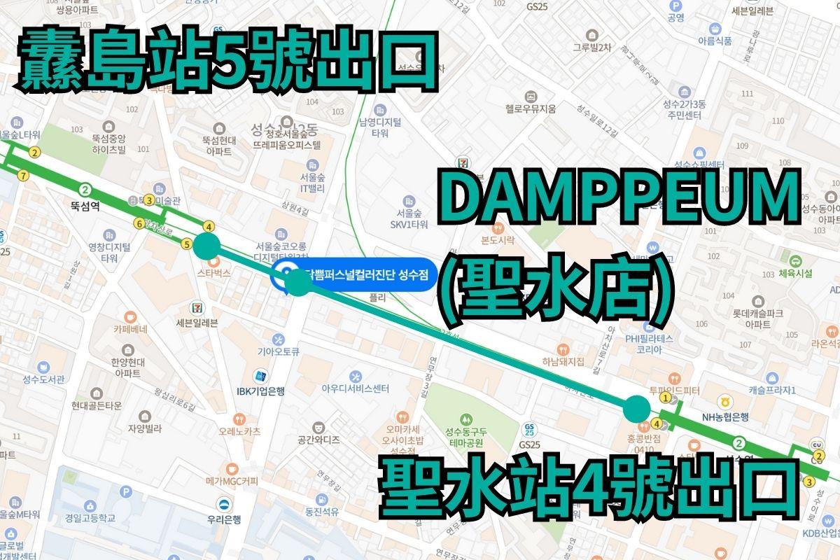 - 小撇步:首尔地铁2号线纛岛站(뚝섬역)5号出口出来直走约100公尺右转,上3楼就会抵达DAMPPEUM(圣水店)。