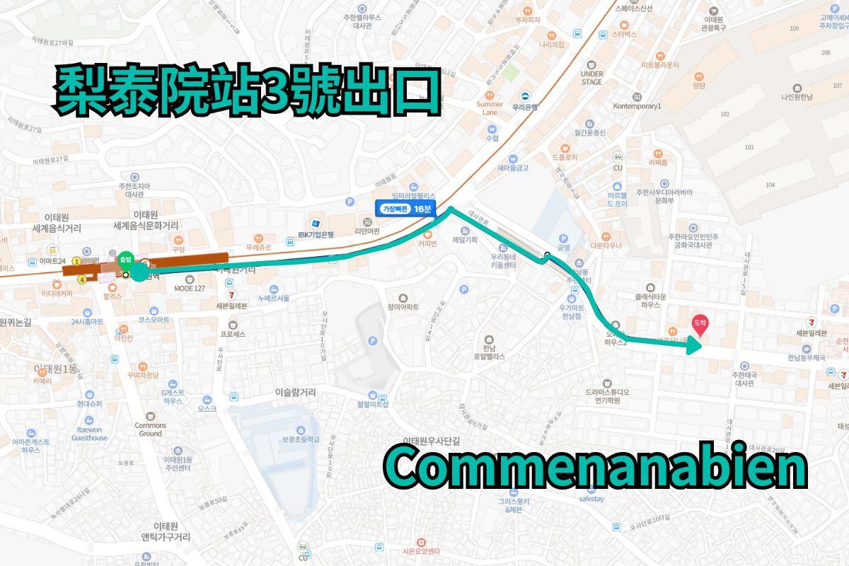 - 交通:首尔地铁6号线梨泰院站(이태원역)3号出口出来步行约16分钟即可抵达Commenanabien汉南店。