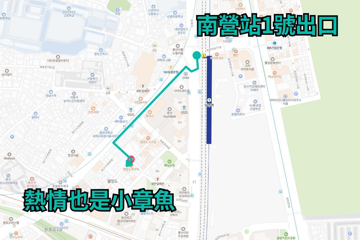 - 小撇步:首尔地铁1号线南营站(남영역)1号出口出来后直走左转,直走右转过人行道后左转,直走经过两个斑马线左转,直走第一个巷口右转,直走左前方即可抵达热情也是小章鱼。