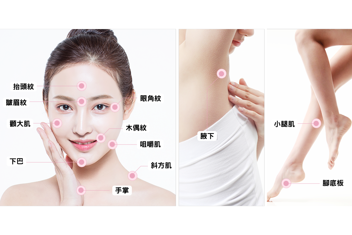 例如脸上的抬头纹、鱼尾纹,以及大笑时鼻翼过宽、改善国字脸(咀嚼肌),甚至是肩颈斜方肌、小腿肌也可以打肉毒,让特定部位放松,达到视觉上肌肉缓和、更加平顺的效果。