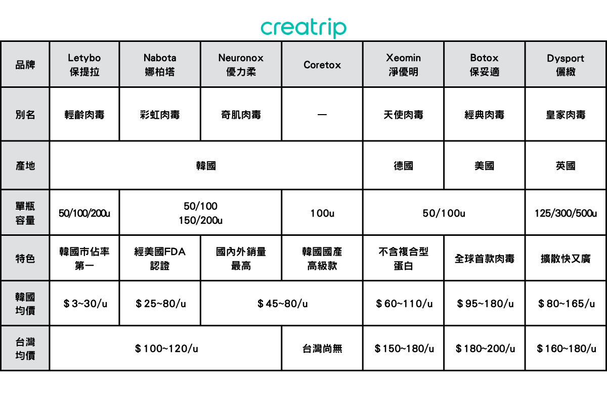 小编分别整理了几款台韩人气肉毒杆菌品牌在两地医美诊所的平均价格比较,大家可以先参考看看、有个概念。