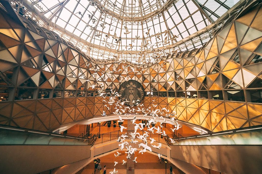 邻近首尔高速巴士地下街,从地铁4号出口出来,就可以看到上图中像帐篷一样的玻璃屋顶,这里就是号称首尔最美的星巴克Famille Park R店。