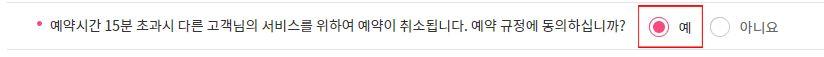 13. 这里是询问「当超过预约时间15分钟而仍未到场时,为了维护其他顾客的权益,此笔预约将自动失效。您是否同意这项预约规定呢?」