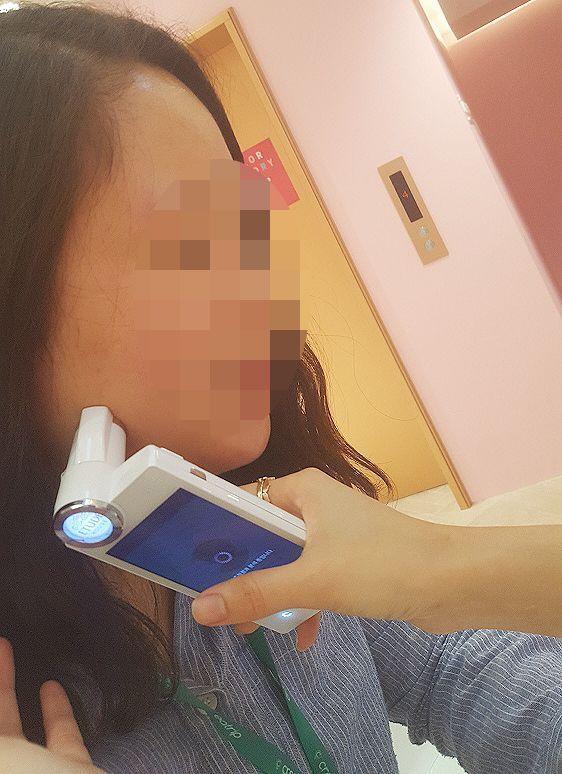 她们会将机器放在没有血丝、红潮、痘疤的下巴侧进行检测喔
