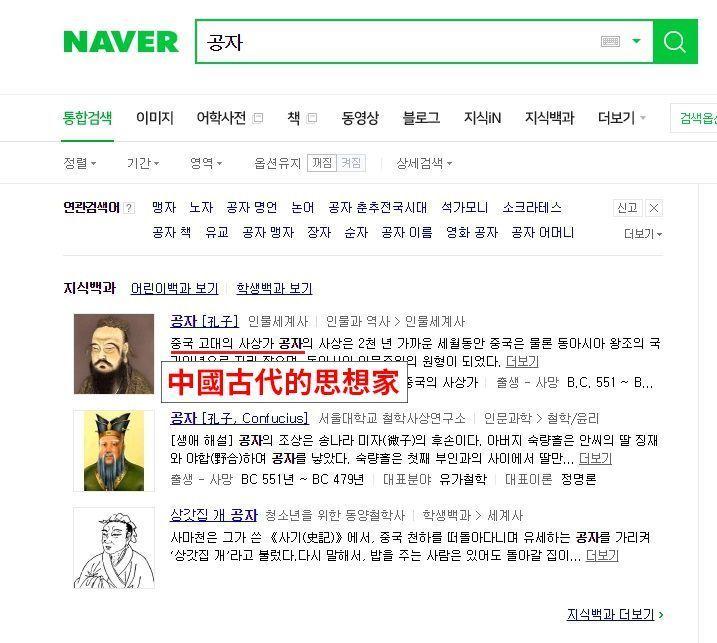 就连在Naver上搜索孔子,也非常清楚地写着"中国的思想家"这样的介绍