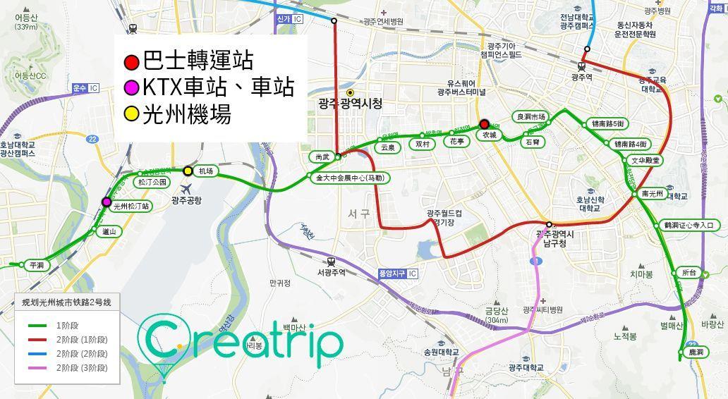 KTX站 | 光州松汀站(광주송정역)有光州地铁1号线、KTX、湖南线、庆全线、光州线、Itx、无穷花号经过,为当地最大的复合转运中心 |