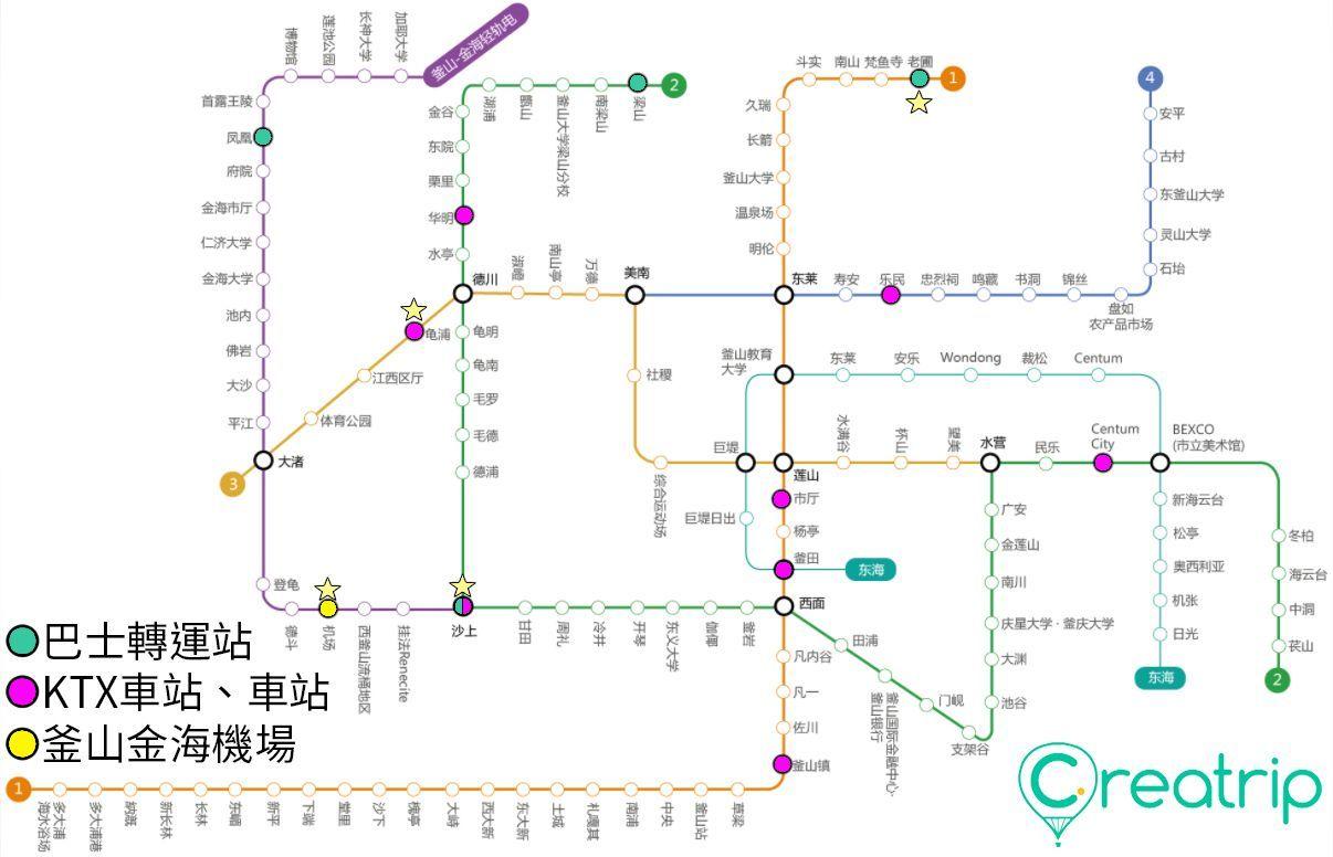 大站 | 釜山站(搭乘KTX通往大田、大邱、首尔之主要出发点) |