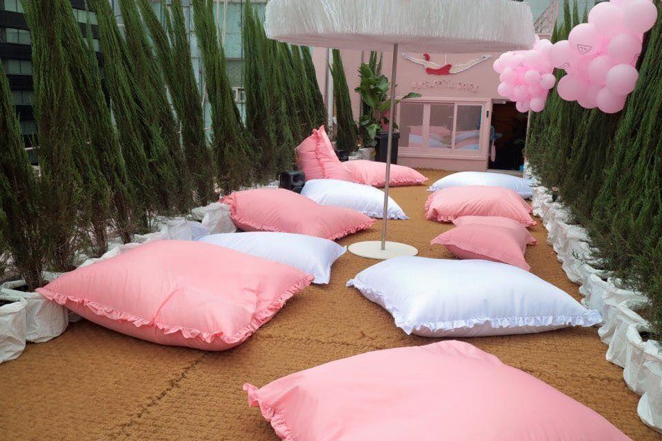 而3CE粉红咖啡厅则是在五楼的部分,因此是以粉色游泳池作为设计主题的~