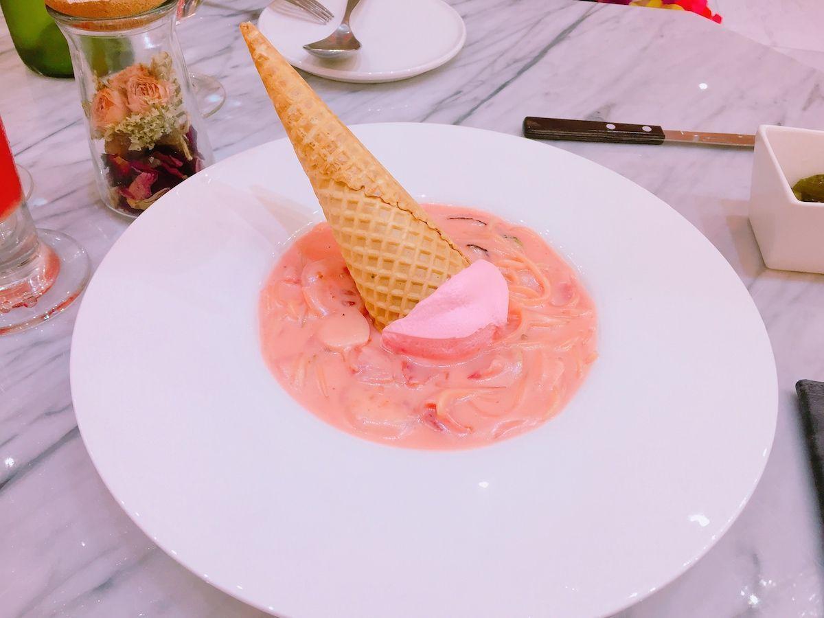 看到意大利面上面的冰淇淋了吗?其实一开始送上来的时候意大利面并不是粉红色的