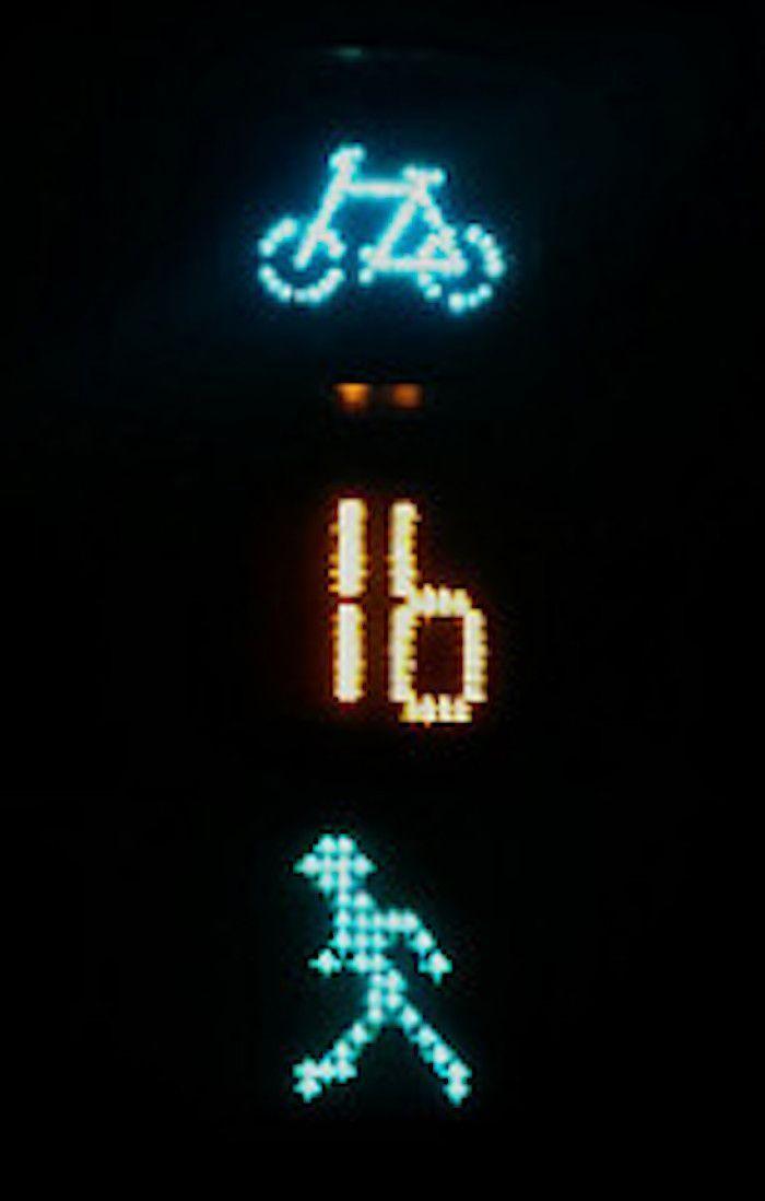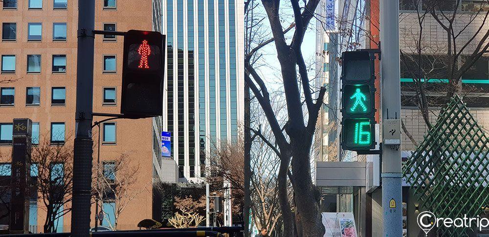 韩国的交通号志是很普通的绿色,数字代表的是号志剩下的时间,虽然可以很精准地告诉大家号志状况,但感觉有点古板、无新意。看看台湾人的斑马线交号志,光是一个可爱的小绿人,似乎就能够感受到台湾人的亲切和可爱呢。