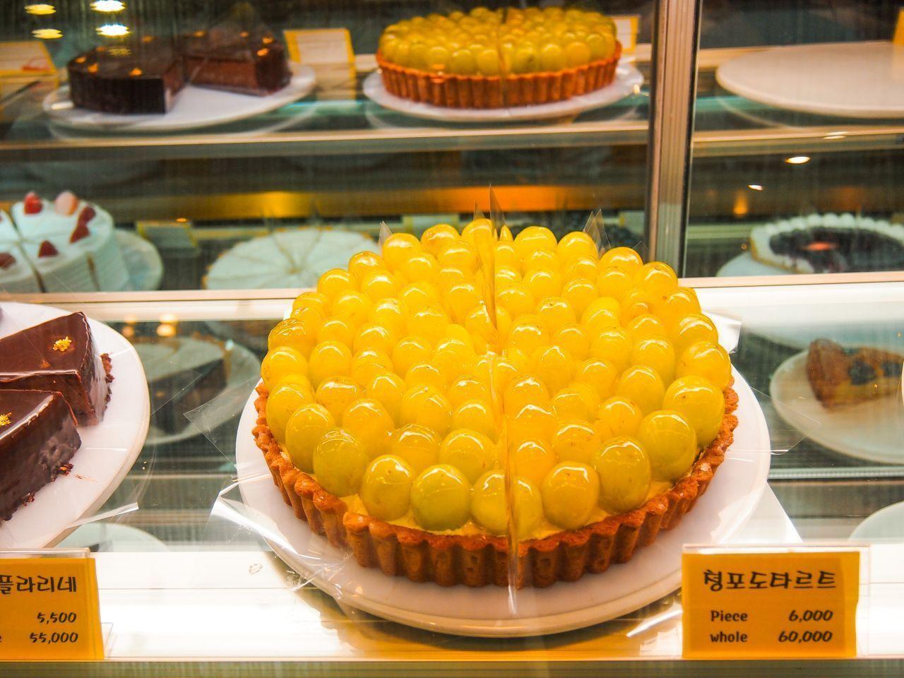 江陵咖啡街有名的L.Bean咖啡 (左) / L.Bean最具代表性的甜点 - 青葡萄塔(右)