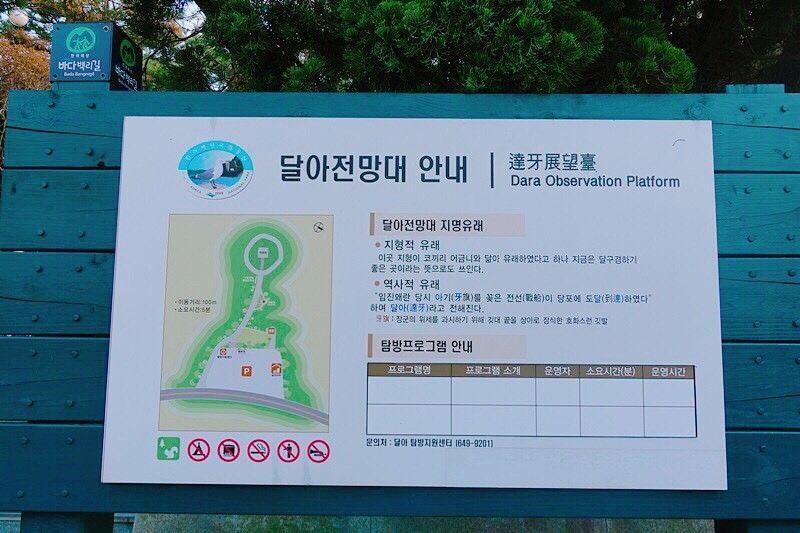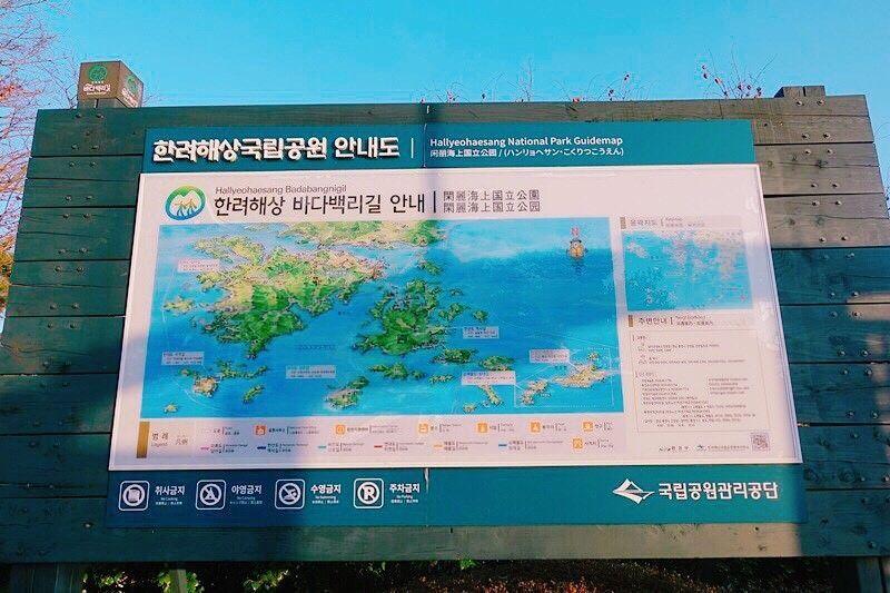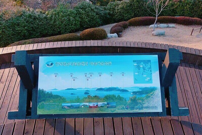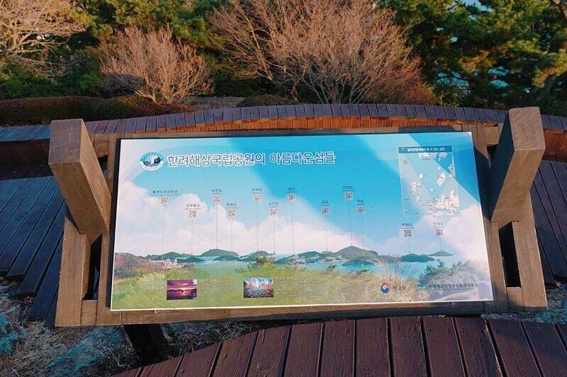 话说是也还满多韩国人来这里看夕阳的,那天大概加我们有个十个人左右吧!展望台的说明板子有两张,左右各一个,在统营这样一看才会惊觉好多小岛喔根本去不完~