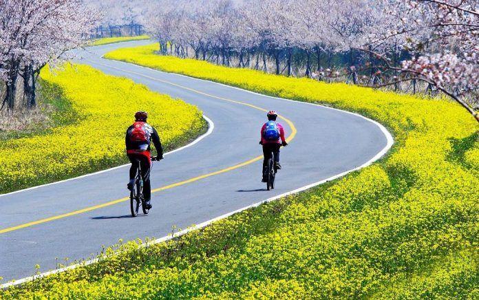 济州岛 在粉嫩樱花和活力油菜花中骑车畅游 图片提供:济州观光公社