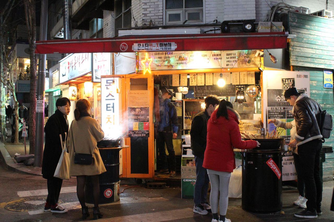 这家首尔美食在位于首尔旅游必去的弘大商圈的怪兽辣炒年糕(몬스터떡볶이),已经由传统的布帐马车小吃车,进化成为小店铺,最特别的地方,是在店前放了一个特别设计的烤肉铁桶,上面是滚烫的韩式鱼片汤,大家就似吃火锅一样围住吃。