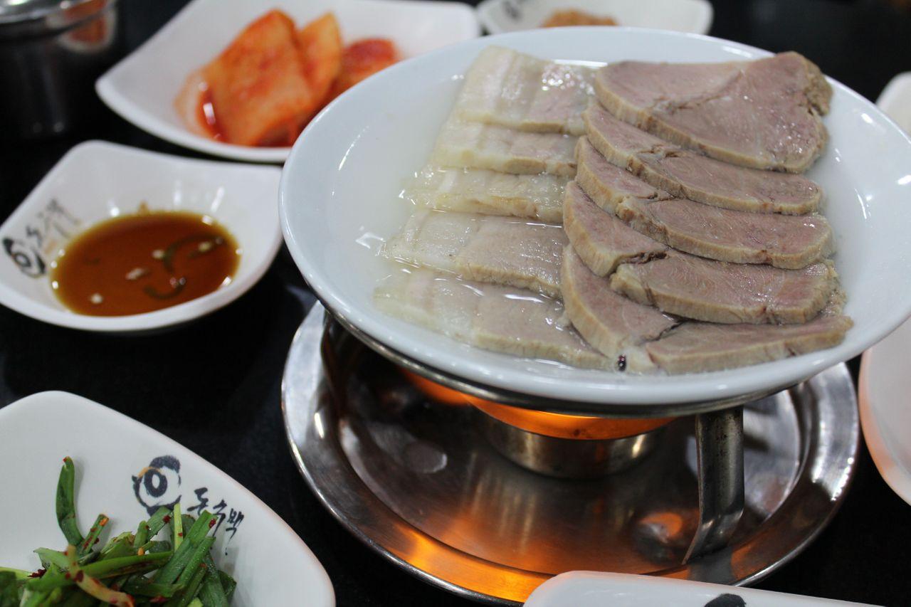 首尔美食:弘大商圈直营的豚寿百(돈수백)个人认为性价比高,店内一律采用济州产的黑猪肉,一人份的돈수백套餐只需要9,500韩元。水煮的黑猪肉片上桌后,用小炉火烘着吃,再另外附送一大碗热腾腾的肉汤,韩国人会将韭菜和特制辣酱、米饭,加入汤中拌匀着吃,肉片则以生菜包住,蘸上咸香的韩式虾酱,带出鲜味。