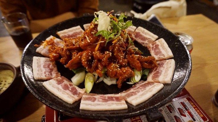 这里的主要餐点是小章鱼跟辣炖排骨。如果不知道该点海鲜还是肉类的话,推荐可以点这个可以一次吃到小章鱼跟三层肉的'小章鱼三层'!