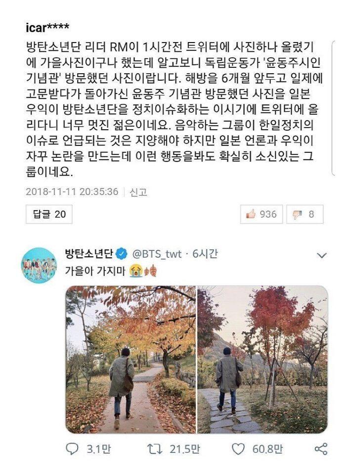 这张旧照被日本媒体形容为「敌视日本」的象征,金南俊(RM)也被挖出2013年韩国光复节时,在SNS上发表了「忘记历史的民族没有未来」等发言,是许多韩国人批判日本殖民历史的用语。