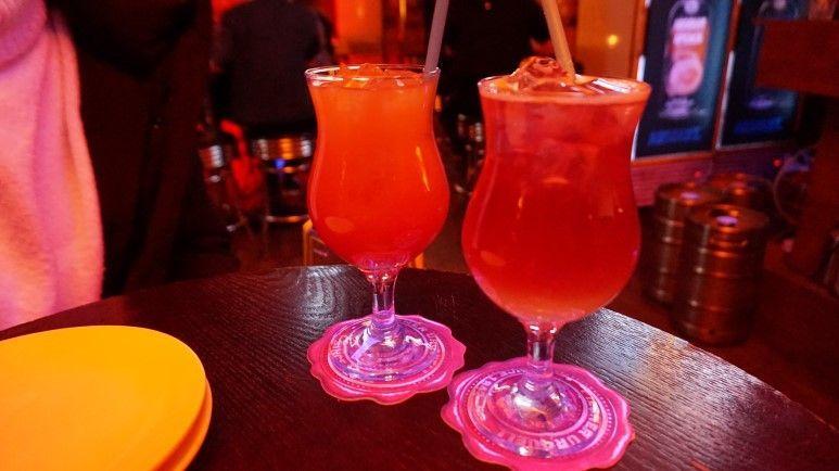 有着红色照明及华丽霓虹灯的这个地方就是喝到饱鸡尾酒吧'Daily party'
