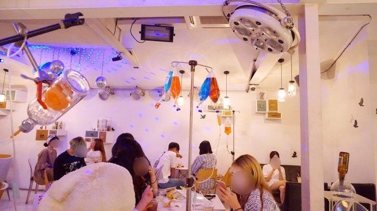 这里除了有贩售用点滴装的鸡尾酒之外,店内还有提供客人能穿上病服体验的空间,所以一进到店里仿佛就像来到医院一样的感觉,非常特别