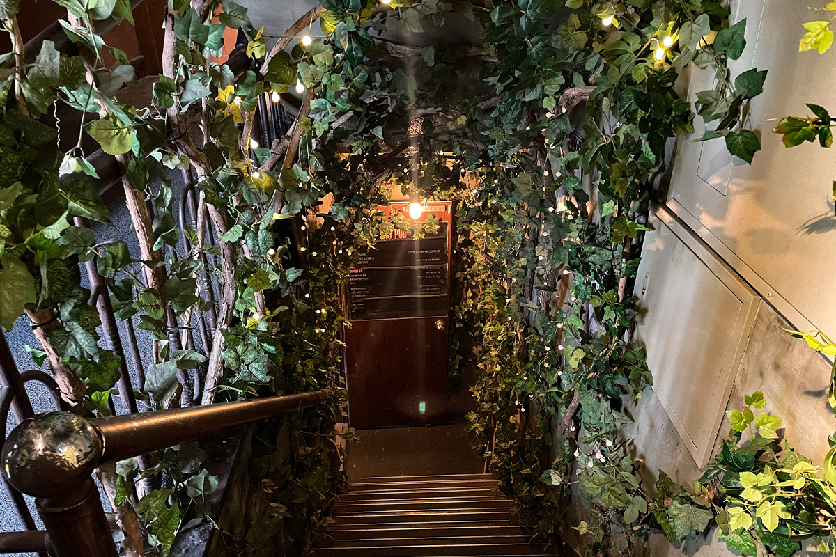 从楼梯下去,树藤缠绕的布景就像是电影中,进入海格小木屋的小径一般。往下走后,就像是进入到海格的小屋,但进去之后,小编想起的场景,是哈利波特和朋友们喝一起喝奶油啤酒的那个酒吧。