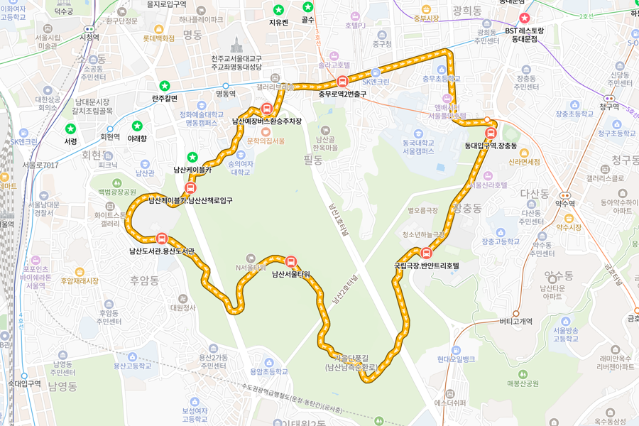 - 位置:忠武路站、东大入口站、南山缆车搭乘处