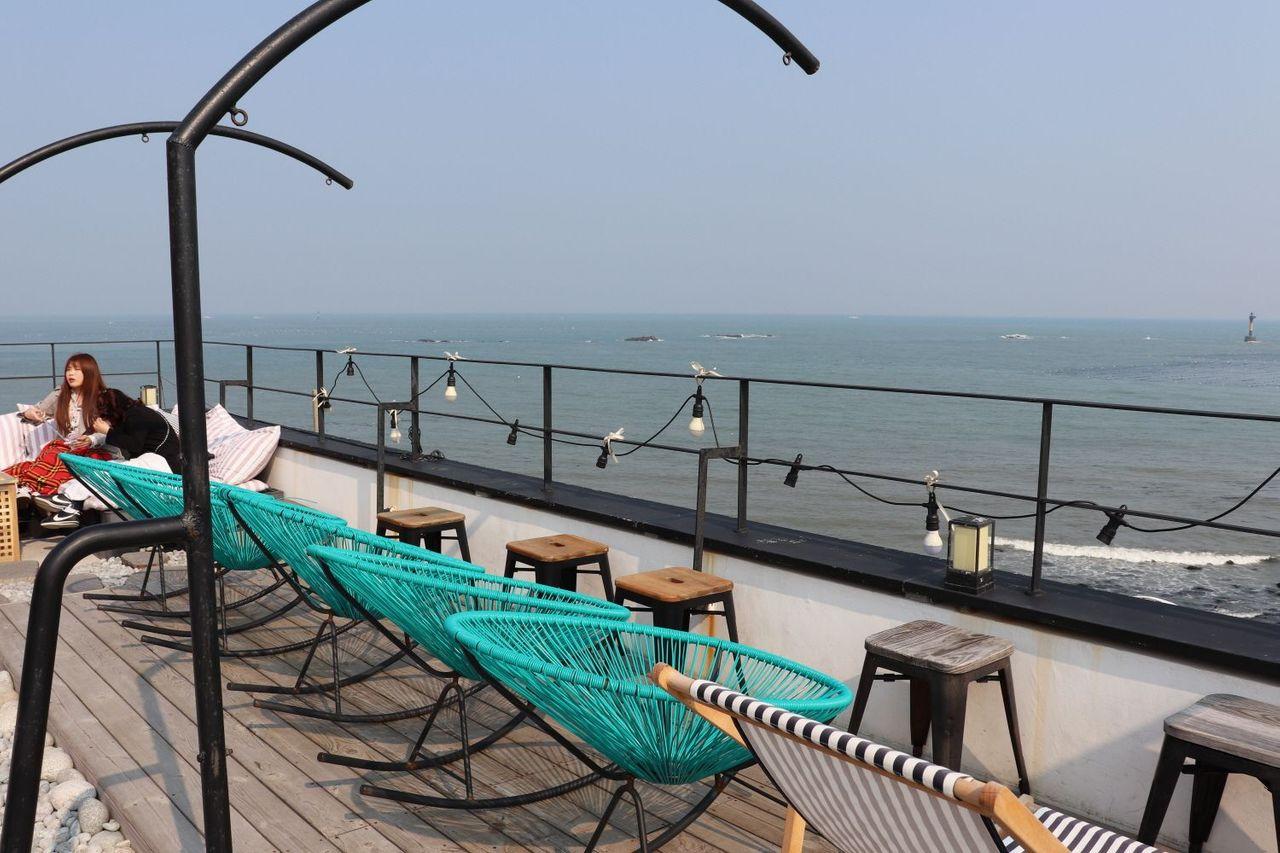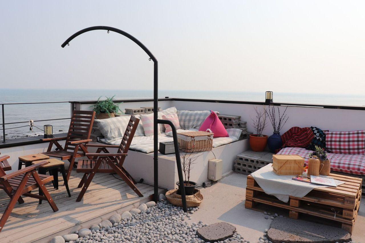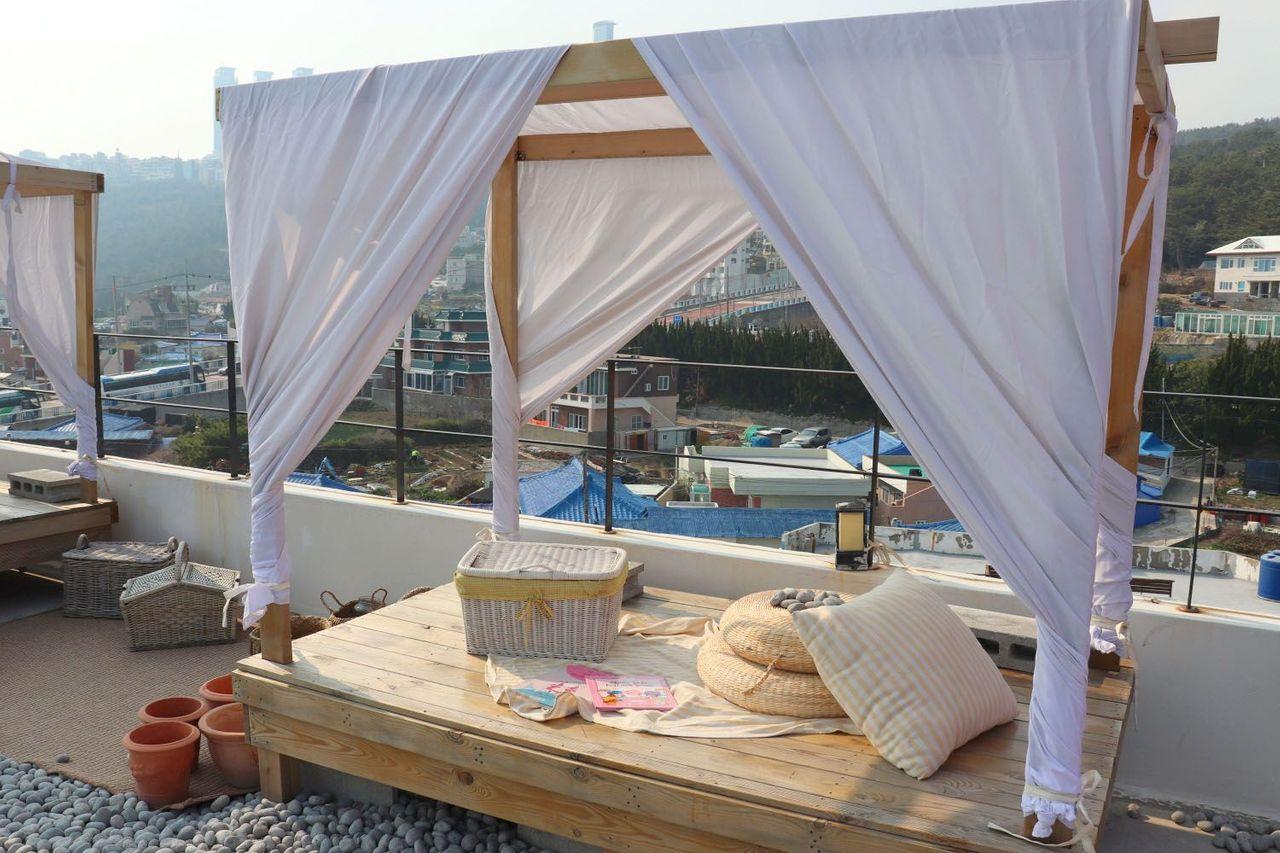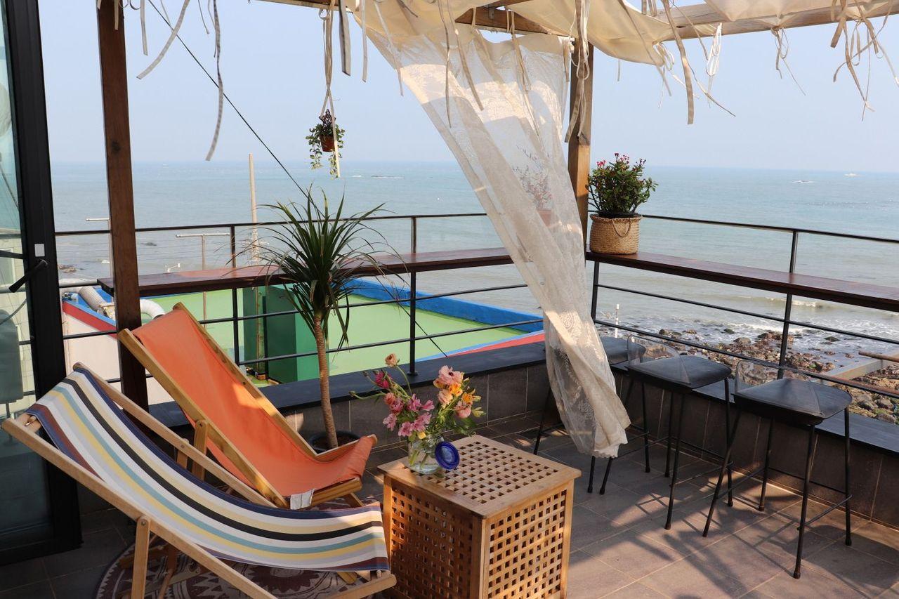 靠近海边的地方有一个阳台,从这里望向釜山海云台的大海也十分美丽,这里摆放了几张躺椅,上方还架设了布篷以遮挡太阳。白天来的话,可以在这个阳台一边观赏大海,一边喝咖啡稍作休息。
