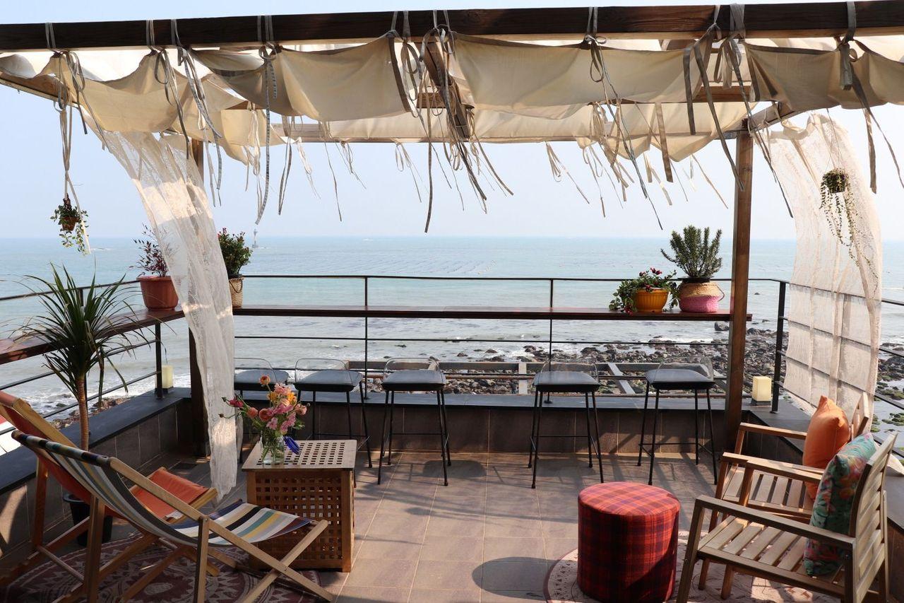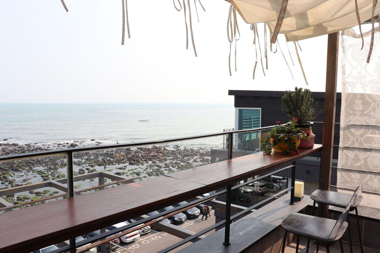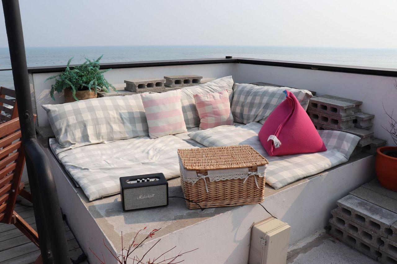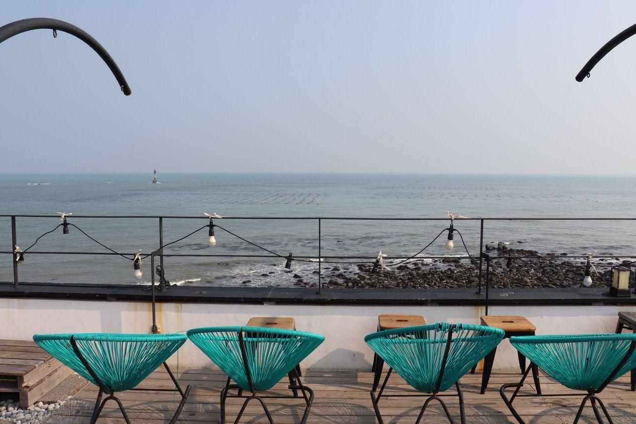 靠近海边的地方有一个阳台,从这里望向釜山海云台的大海也十分美丽,这里摆放了几张躺椅,上方还架设了布篷以遮挡太阳。白天来的话,可以在这个阳台一边观赏大海,一边喝咖啡稍作休息。