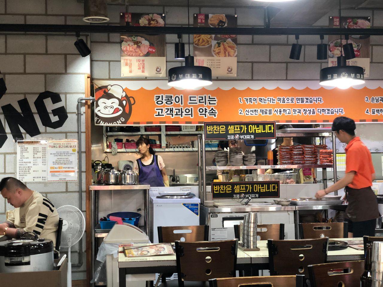 藏身在釜山南浦洞闹区的美食「金刚部队锅」,看到招牌的猩猩,就知道是这间没错了。相比许多昂贵的南浦洞商圈美食,金刚部队锅算是非常实惠,而且物美价廉的美食。