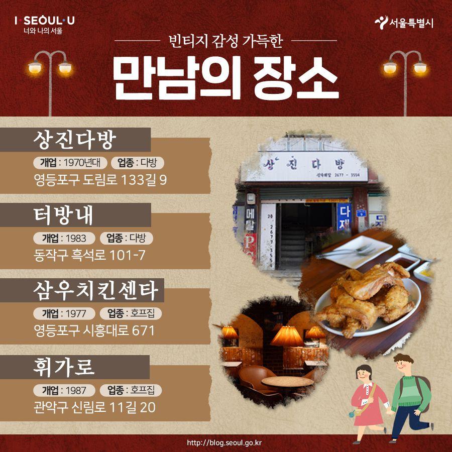 以上就是首尔西南地区老店汇集的精选篇,小编为大家整理出较有特色,且有浓浓韩国人文民情的老店,大家若喜欢这样的复古风,可以来走走,或是看看住宿地附近有没有类似的老店,可以探险一下啰。