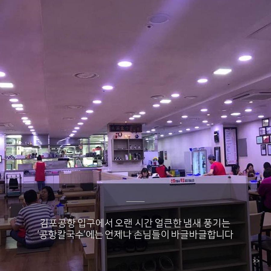 第一间是位于金浦机场附近的机场刀削面。创立于1979年,招牌刀削面是辣辣的口感,加上许多菇类跟Q弹面条。吃过了人都说赞。位于金浦机场附近,让许多出国回来的旅客,可以一尝传统的家乡味。