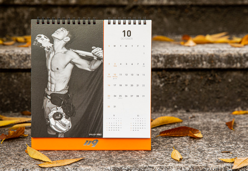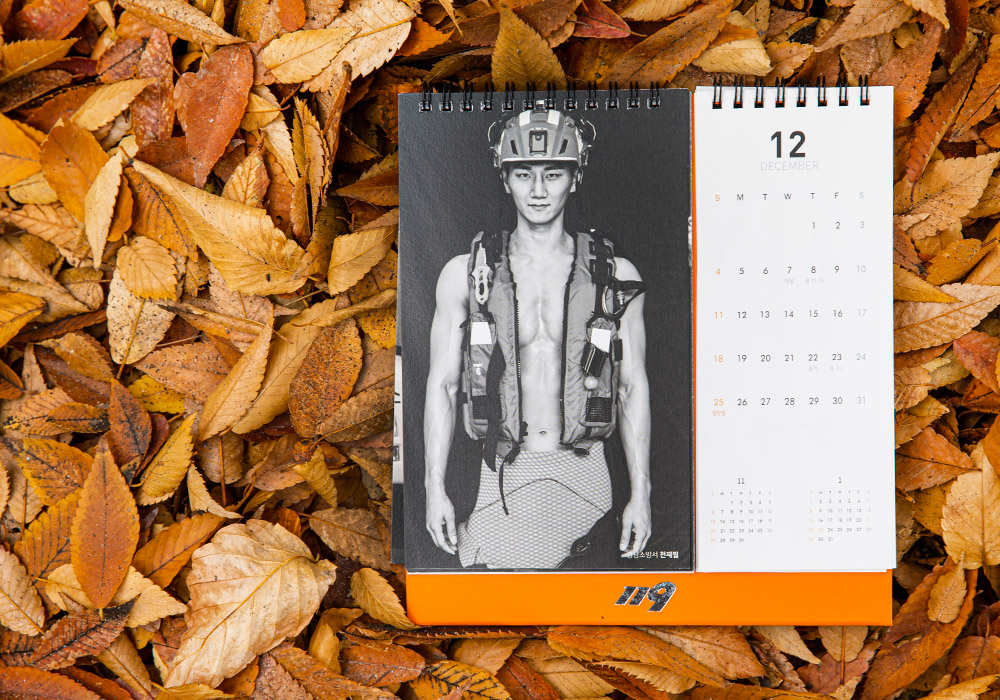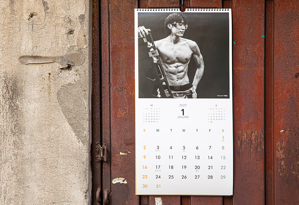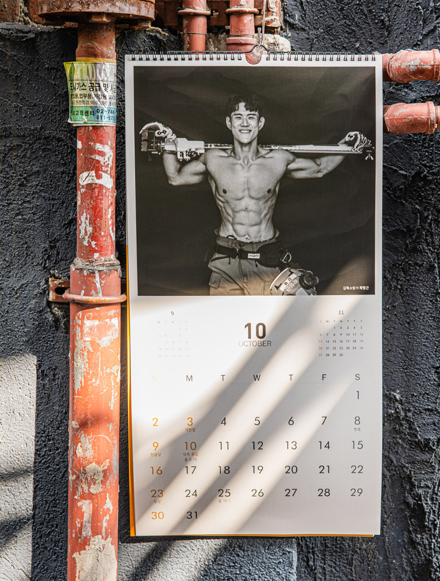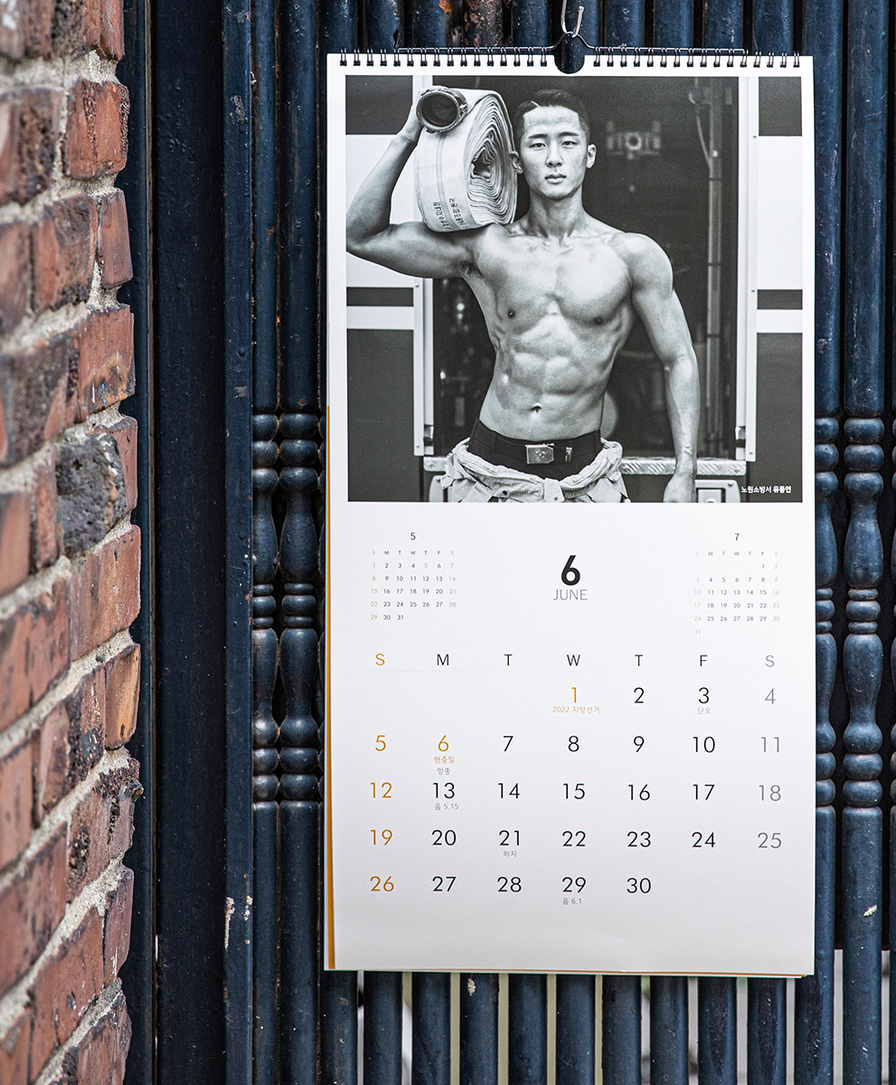 在2022年首尔消防猛男月历中,除了有挂历之外,还有一般桌上直立式的月历,而内页清一色都是透过健身消防员影像审查过后,选拔出的17名消防人员写真照。