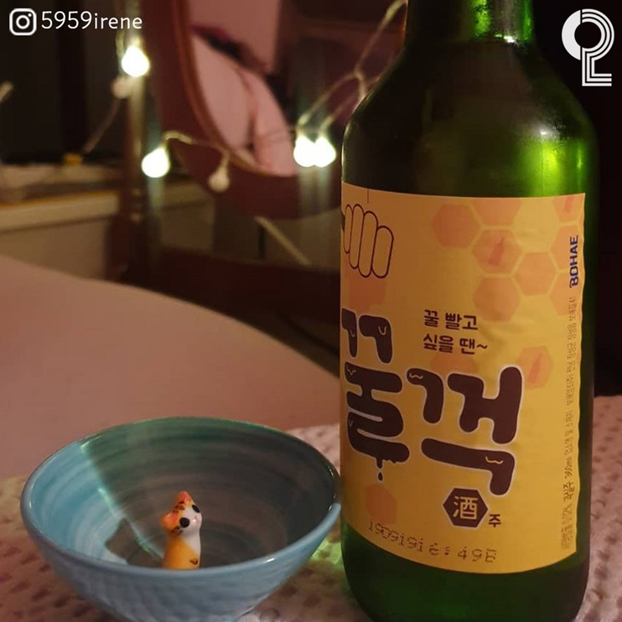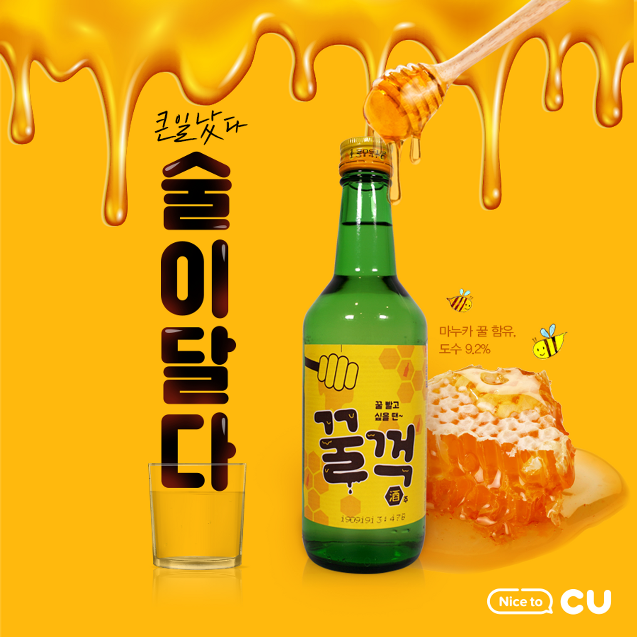 接下来要介绍的,是CU推出的蜂蜜烧酒!一瓶₩1,700的蜂蜜烧酒,酒精浓度9%,蜂蜜含量则是0.02%。如果不喜欢烧酒的苦味跟酒精味,这款烧酒会是很好的烧酒入门!