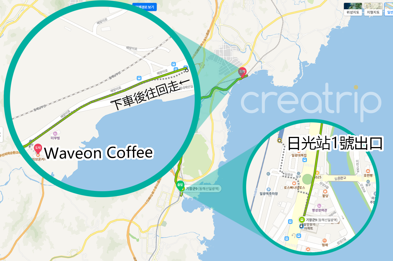 • 小撇步:日光站1号出口出来到对面右转后,于「东海线日光站(동해선일광역)」巴士站搭机张郡9号巴士、180号巴士,至「机张文化礼仪学校(기장문화예절학교)」下车,往相反方向直行3分钟,就能看到Waveon Coffee;或直接从日光站搭计程车前往(车资约₩9,000)。