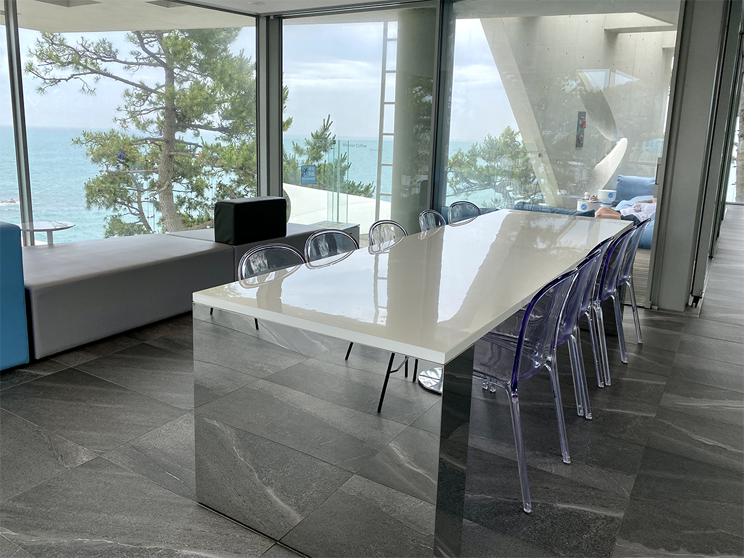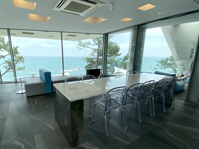 在另一侧这里有个四面都是落地窗,可一览无遗看见釜山海景的位置,中间这张长形大桌,也很适合团体客人在这里用餐。