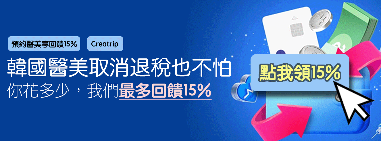 韩国医美退税制度正式在2025年12月31日告一段落,但别担心,透过 Creatrip预约韩国医美诊所可享最高15%回馈,让你享受比退税制度更好的优惠,比过去退税更划算,直接帮你省更多。