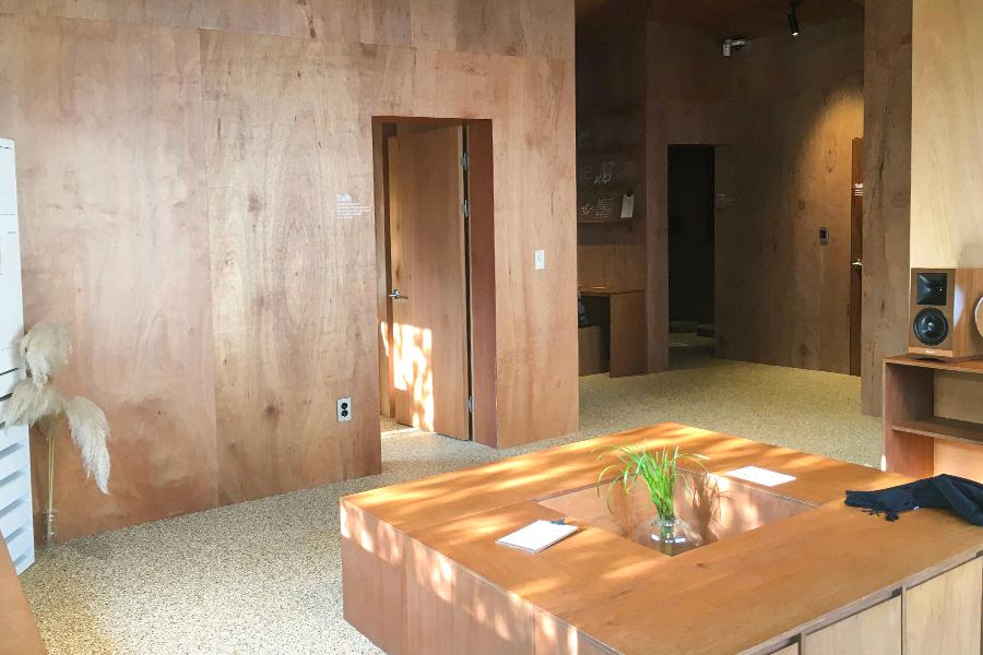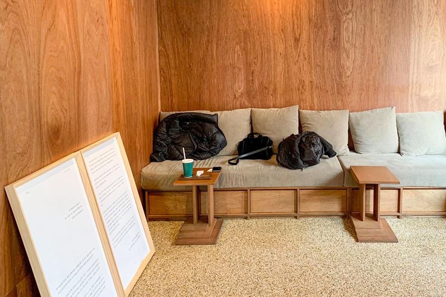 走到楼上,这里也是类似的舒适木制内装潢,有窗边桌椅,但有更多隔间座位和艺术展示,放松的音乐营造适合阅读的氛围,也适合做场白日梦。