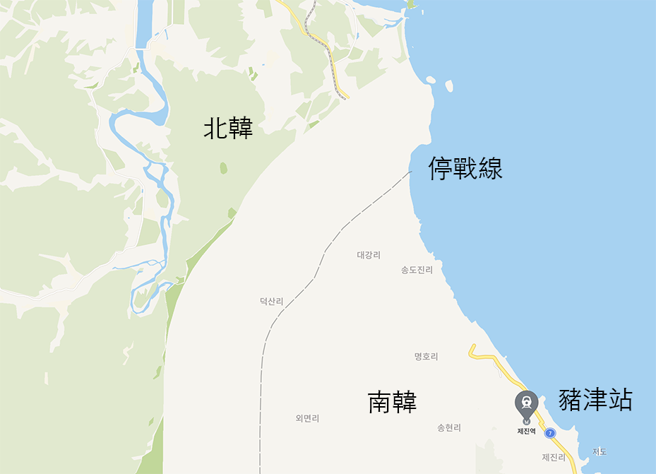 从地图上来看,猪津站(제진역)是朝鲜半岛中,南韩领土最北的一个车站,距离南北停战线相当近;这里其实原有连接南北韩的纵贯铁路,但在1967年被废除后至今,仍是荒废的状态。而04月23日,第313次南北交流合作促进会议上,「江陵-猪津」之间铁路连接的事业,被公认为「韩朝合作事业」,免除调查直接进行。