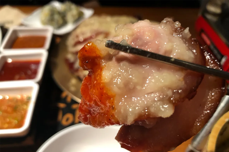 肥吱吱的三层肉在铁板上烤得金黄,逼出油脂后沾上香油、辣酱,包进生菜里面一口下肚,就是最完美的口味。不过这间店在大家心中,「荒谬的生肉」评价似乎呈现两极化的分布呢?
