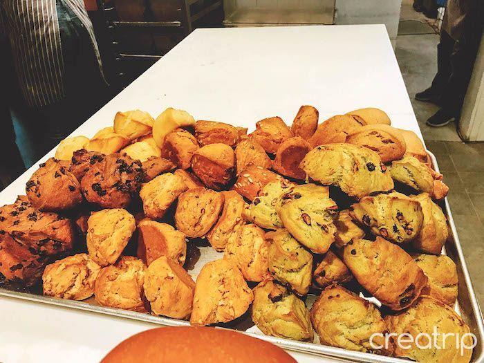[韩国必吃美食:圣心堂]为了让客人可以尽情试吃,店内准备了很多试吃面包。
