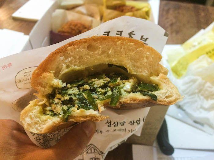 而在圣心堂中人气仅次于炸波萝面包的就是「韭菜面包」啦!在面包里面放入韩国传统的炒韭菜加猪肉内馅,在1986年由圣心堂首度开卖,甚至还取得了专利呢!这个面包在买来的4个小时内食用完毕最佳!