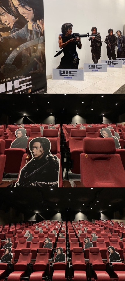 而在影厅内部,为了让大家保持防疫距离,郑锡(姜栋元饰)的照片被固定座位上,给了观众和姜栋元并排看电影的乐趣。放映电影前,也会播出姜栋元给观众的影像信,提供粉丝观看《尸速列车:感染半岛》的另一乐趣。