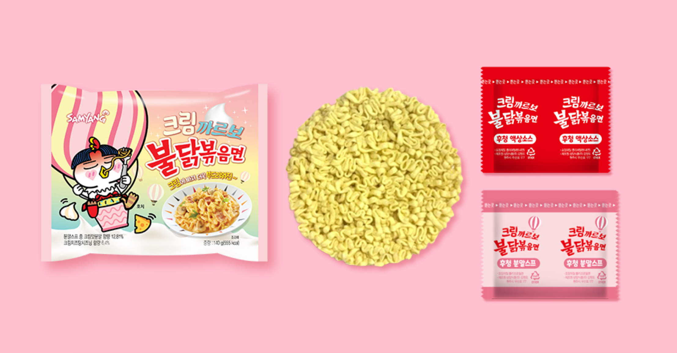 奶油卡邦尼辣鸡面将比现在市面上贩售的奶油辣鸡面,更强化奶油的香醇,在粉包里添加奶油的原料,吃起来的口感会更为细腻、柔软,包装也采用更为柔和的粉嫩色调,与原本辣得要命的鲜艳红色做出区别。